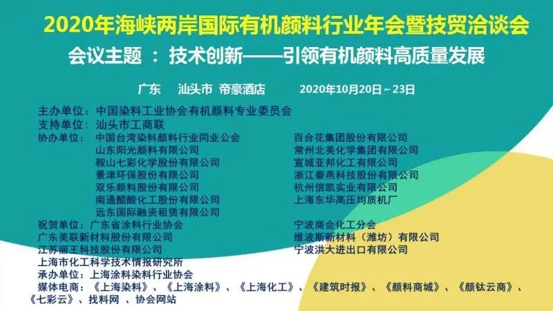 ?在后疫情時期的特殊背景下,為了促進(jìn)國內(nèi)外企業(yè)技術(shù)交流、溝通信息、拓展國內(nèi)外市場,在中國染料工業(yè)協(xié)會的領(lǐng)導(dǎo)下,由中國染料工業(yè)協(xié)會有機顏料專業(yè)委員會主辦的“2020年海峽兩岸國際有機顏料行業(yè)年會暨技貿(mào)洽談會”定于2020年10月20日?23日在中國廣東省汕頭市龍湖區(qū)帝豪酒店召開.